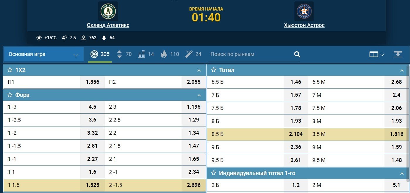 В линиях большинства букмекеров помимо общего тотала на матч есть индивидуальный тотал. Тотал ранов «Астрос» больше 4.5 можно взять за близкий коэффициент — 1.95. Для такой ставки неважно, насколько надежно выступит Хавьер в этот раз, и она нивелирует возможное преимущество «Атлетикс» в концовке.