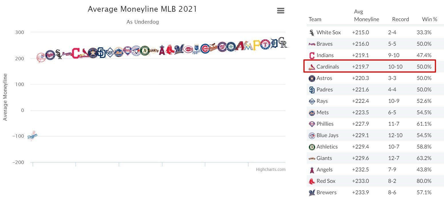 Очень удобно оценить доходность ставок на примере «Кардиналс»: в статусе аутсайдера команда проиграла 10 матчей и 10 выиграла. Прибыль за эти 20 матчей составила 19,7×10=197 долларов при 2000 долларов ставок. ROI=9,85%.