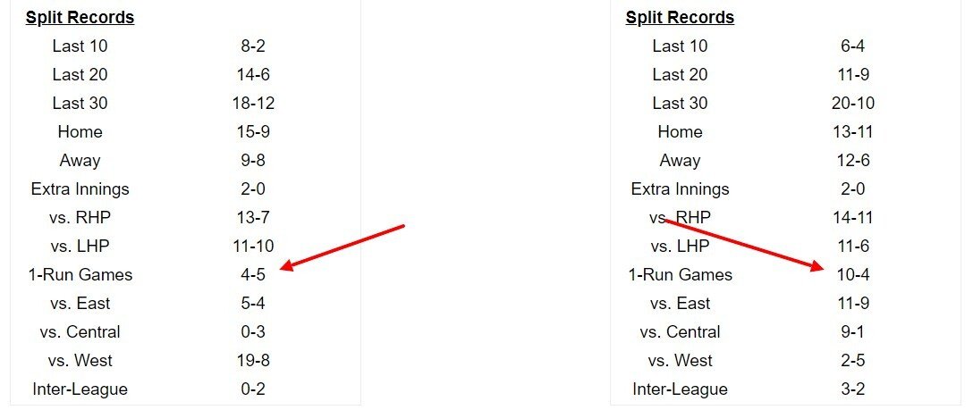 В пользу «Окленда» — очень крутая статистика «1-Run Games»: в концовке 10 матчей команда удержала лидерство в один ран и 4 раза проиграла в той же ситуации. «Астрос» 4 раза выиграли и 5 раз проиграли.