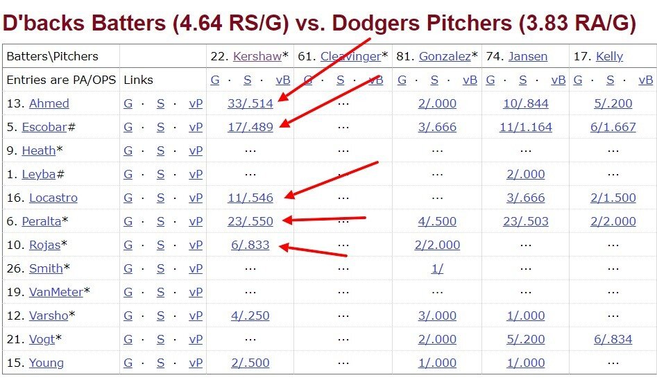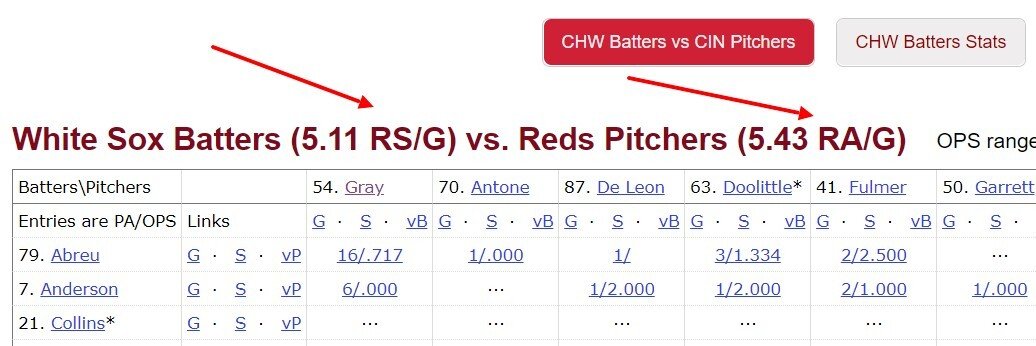 С прошлого года на «Референсе» сделали платной одну из самых полезных страниц — со статистикой игры отбивающих против конкретного питчера. AVG бесплатно показывают в превью на сайте MLB.com, а OPS — здесь же на «Референсе» в табличке Batters vs Pitchers.