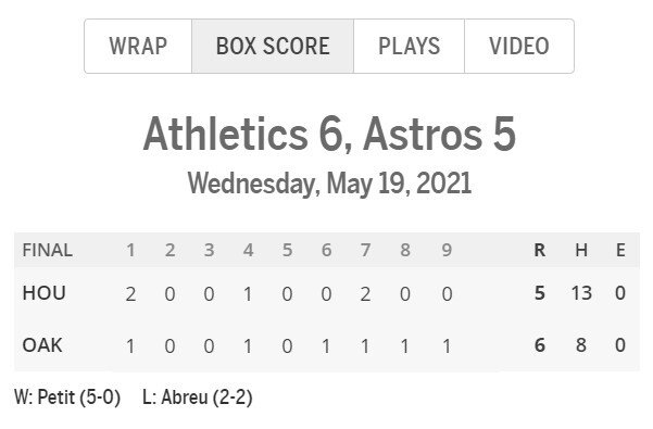 Анализировать будем игру в ночь с 18 на 19 мая 2021: «Окленд Атлетикс» принимают «Хьюстон Астрос», чемпионов 2017 года. «Окленд» — лидер дивизиона и фаворит, кэф на победу команды — 1.856. Кэф на победу «Астрос» — 2.055.