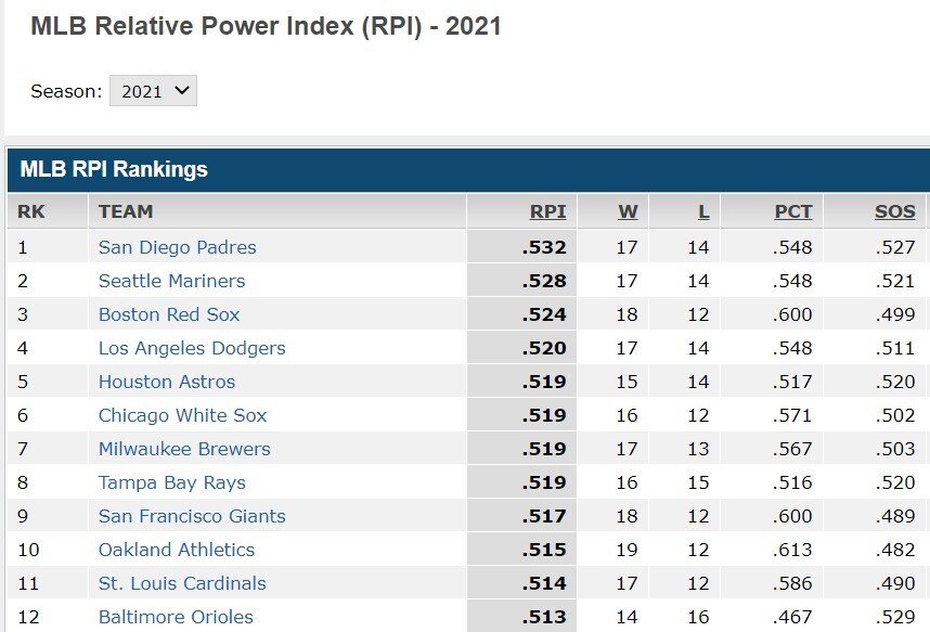 Например, в начале сезона-2021 больше всех выиграли «Окленд Атлетикс», но так как они играли против относительно слабых команд, в рейтинге они лишь на 10-м месте. А лидеры рейтинга «Сан-Диего Падрес» на момент написания обзора шли третьими в своем дивизионе.