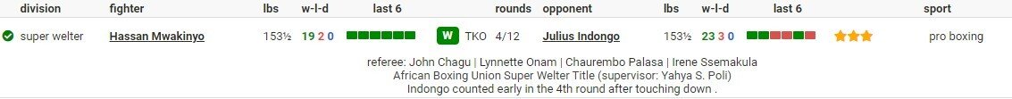 Другой пример — победа танзанийского боксёра Хассана Мвакиньо над Джулиусом Индонго (намибиец, к слову, дрался в титульнике с Теренсом Кроуфордом).