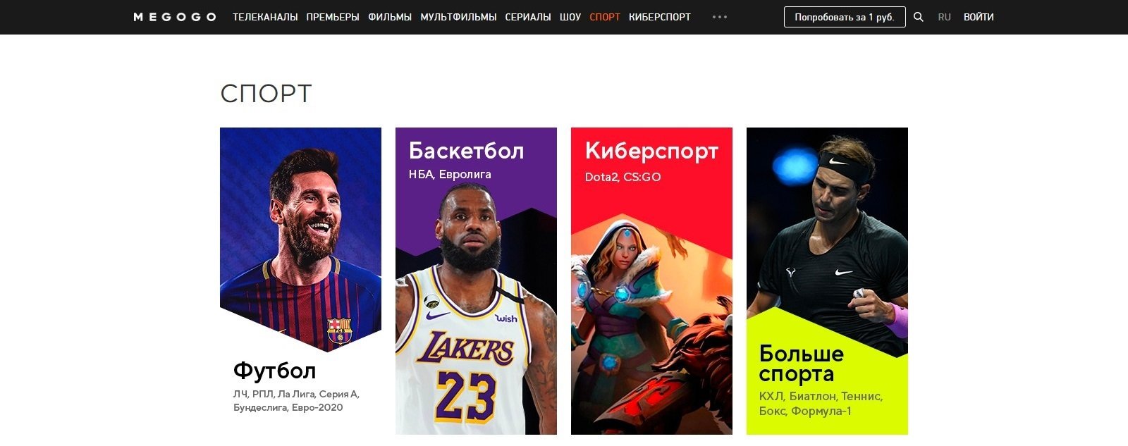 Спортивный раздел. Пользователи с подпиской на «Мегого» смотрят матчи НБА, Ла Лиги и Серии А в прямом эфире и в записи.