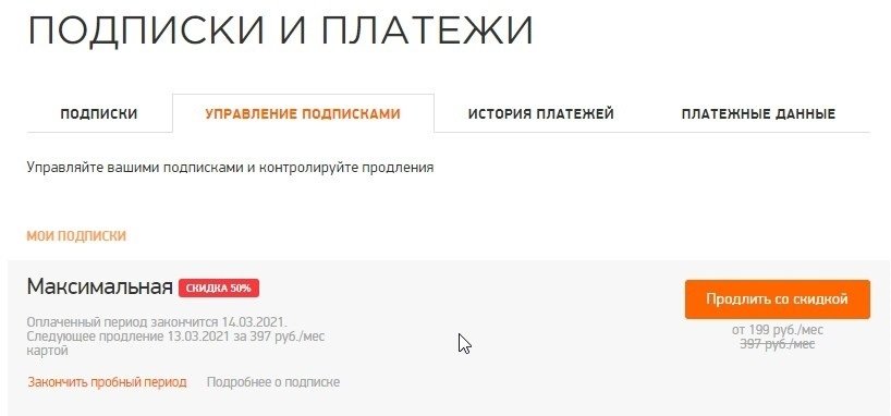По завершении регистрации зайдите в раздел «Подписки и платежи» в личном кабинете, выберите подходящий вариант и нажмите соответствующую кнопку. Обратите внимание: при оформлении подписки нужно вводить данные банковской карты.