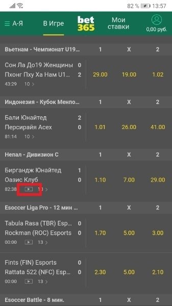 В линии такие матчи отмечены значком «Play». Зайдите на страницу матча и нажмите на «Play» для просмотра видео. Для остальных матчей есть инфографика событий на игровом поле.