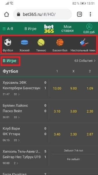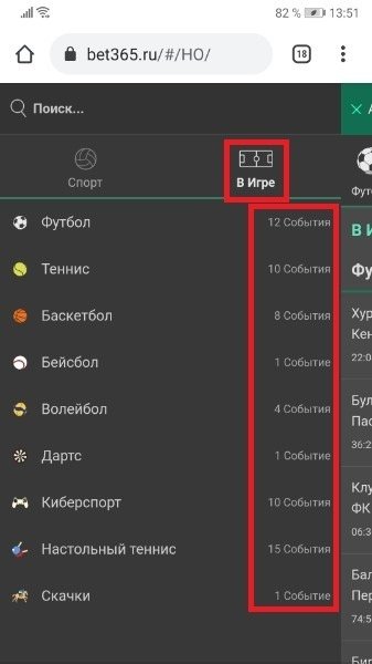 В Игре. Список событий для ставок в режиме Live — первое, что видит пользователь на мобильном сайте bet365.ru. Нужные матчи можно найти в списке видов спорта в верхней строке или в боковом меню слева. Цифра рядом с названием дисциплины — количество матчей, на которые букмекер принимает ставки в эту минуту.