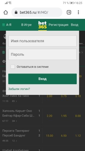 Пункт «Вход» также находится на главной странице мобильной версии bet365.ru. Букмекер предлагает только один способ авторизации — с помощью логина, который вы придумали, создавая аккаунт.