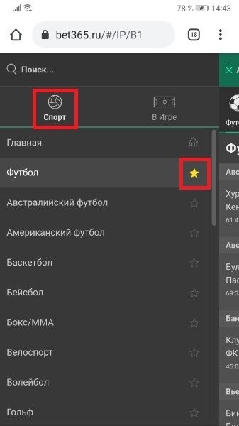 Спорт. Полная линия букмекера bet365. Список видов спорта в алфавитном порядке находится в боковом меню. Для доступа нажмите значок с тремя линиями в левом верхнем углу. Если отметить интересующую дисциплину «звездочкой», она окажется вверху списка. На нижних строчках находятся разделы самых популярных событий для ставок и матчи с котировками меньше 2.00. Это может пригодиться в экспресс-ставках.