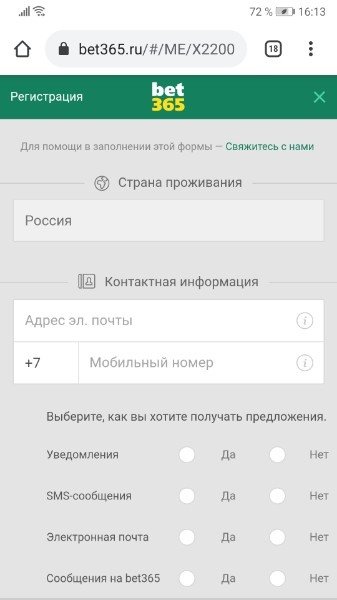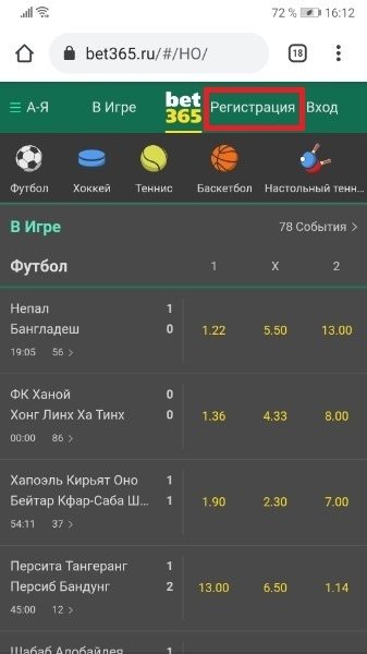 Для создания учетной записи в мобильной версии сайта bet365.ru нажмите ссылку «Регистрация» на главной странице сайта.