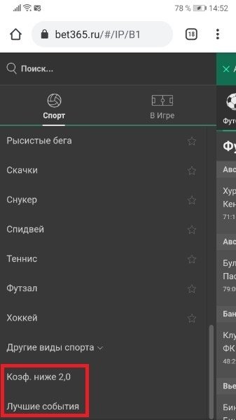 разделы «Коэффициент ниже 2.00» и «Лучшие события».