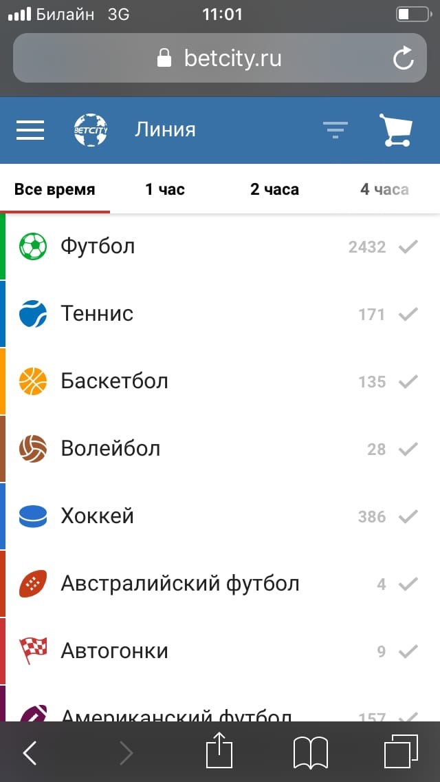 Поиск матчей в мобильной версии BetCity