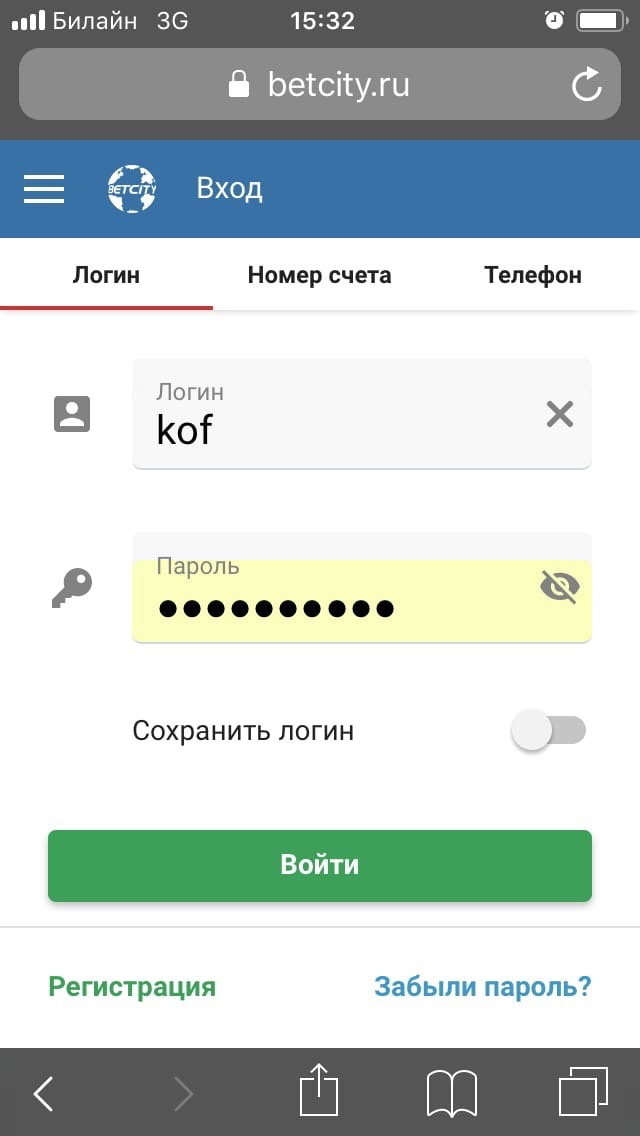 Вход в личный кабинет расположен там же, где и раздел с регистрацией. Авторизоваться в мобильной версии можно с помощью логина, номера счета или телефона.