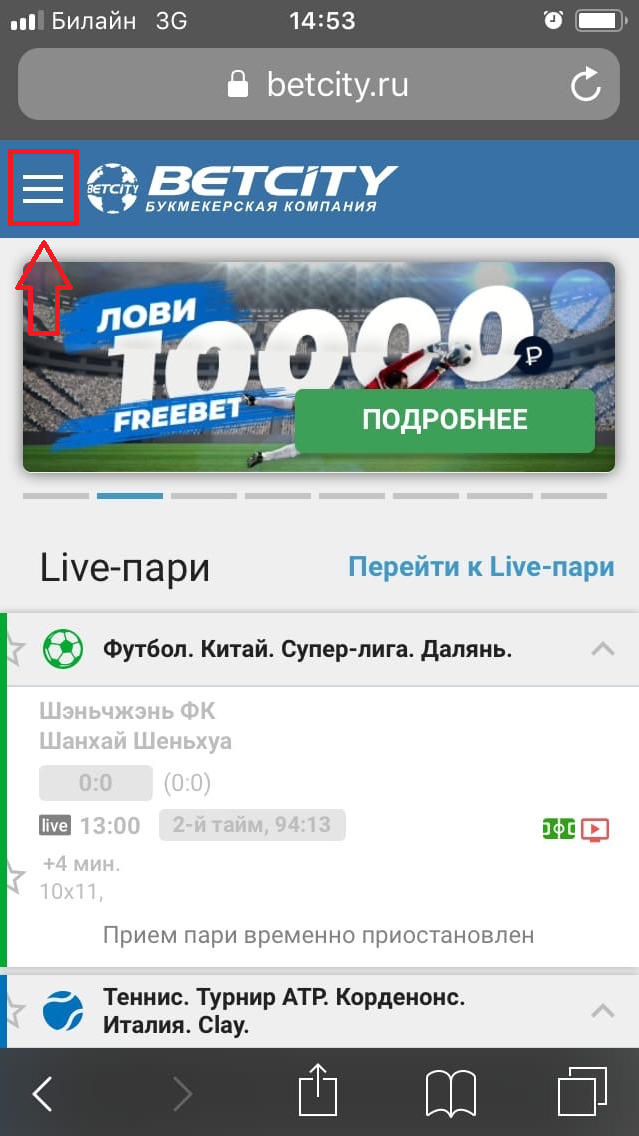 Чтобы создать аккаунт в мобильной версии БК «Бетсити», перейдите в меню, расположенное в левом верхнем углу экрана.