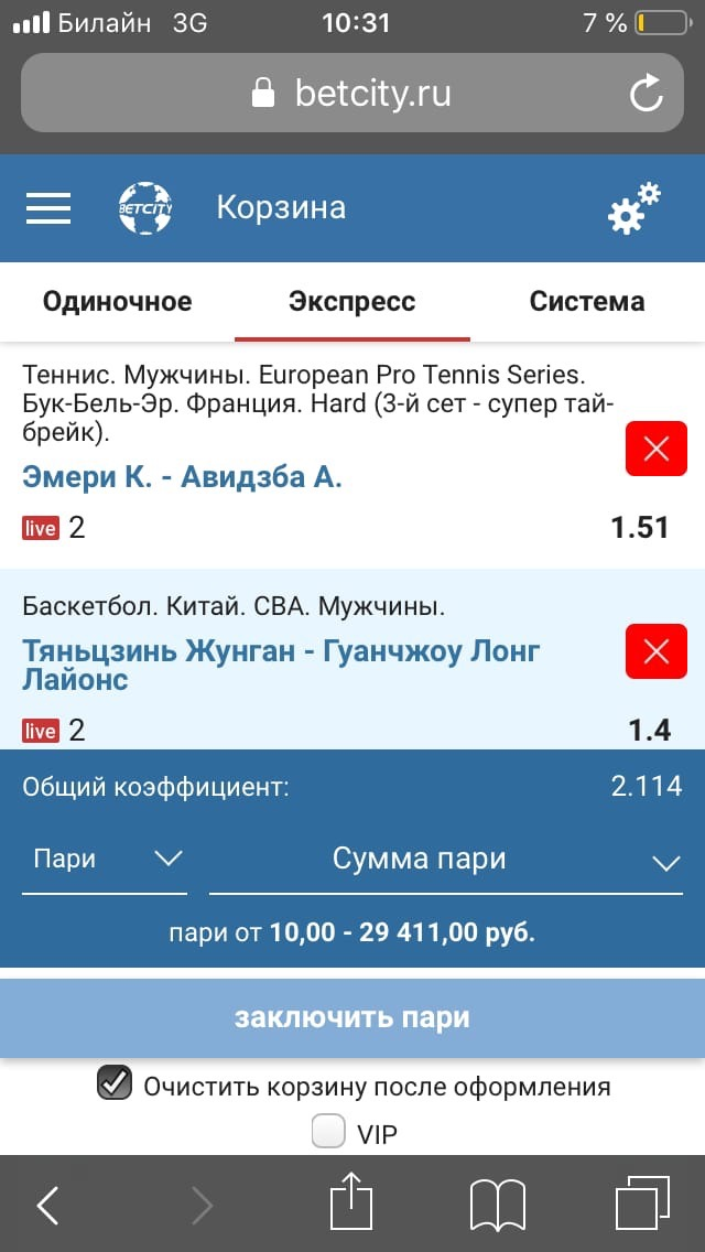 Чтобы сделать ставку, нажмите на нужную котировку, перейдите в «Корзину», введите сумму и нажмите «Заключить пари». Для составления экспресса выберите от двух исходов. Для заключения пари системой — от трех.