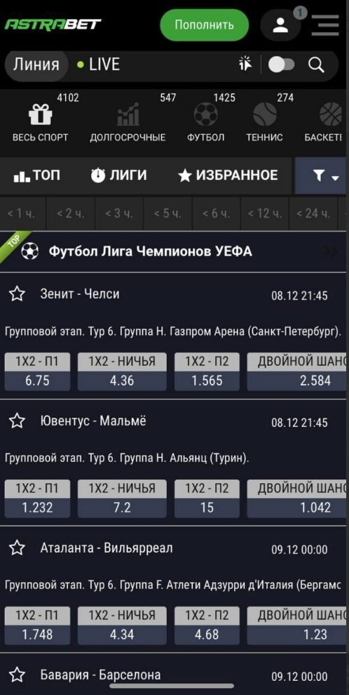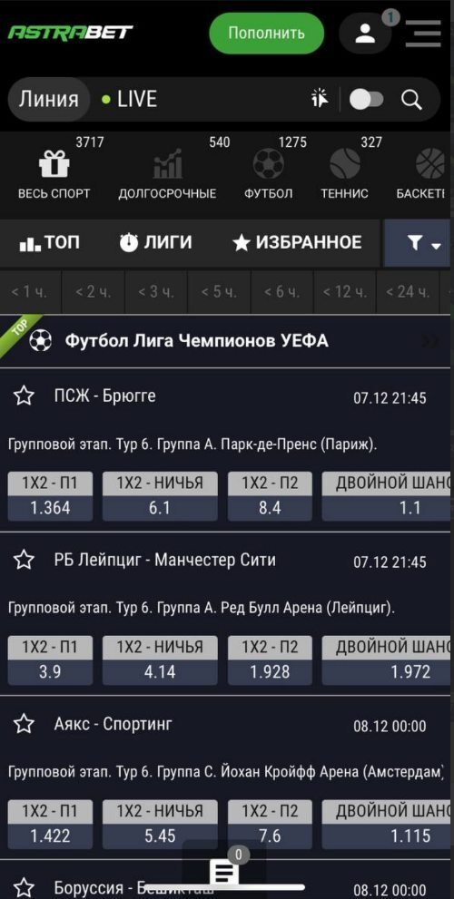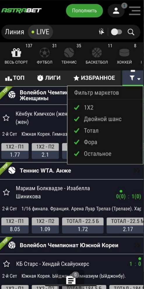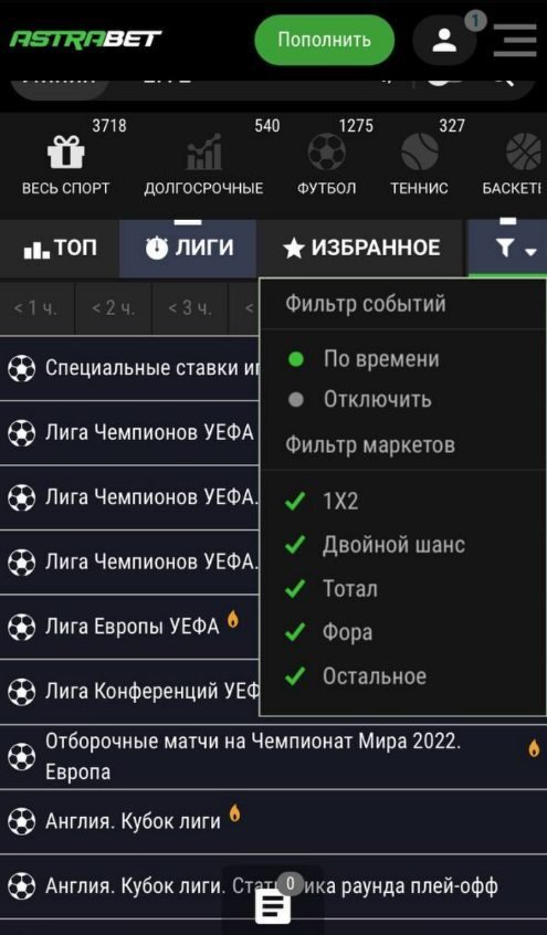 Лайв. Внешне лайв-раздел Astrabet полностью повторяет линию, за исключением одного — здесь отсутствуют временные фильтры.