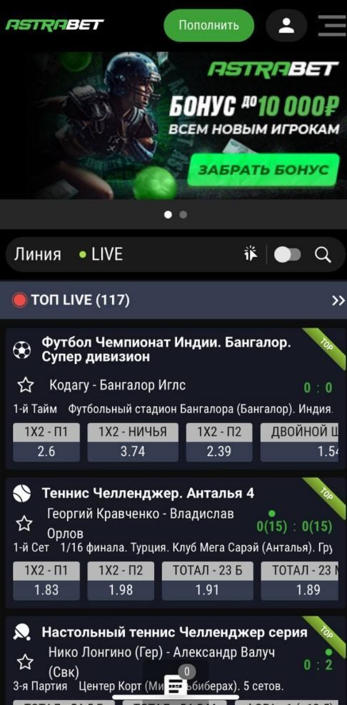 Главная страница. В верхней части главной страницы расположен логотип БК «Астрабет», кнопка «Пополнить», кнопка личного кабинета и меню в виде гамбургера. Ниже располагается слайдер с актуальными бонусами и список топ-событий в лайве с указанием общего числа соревнований, на которые букмекер принимает ставки в реальном времени.