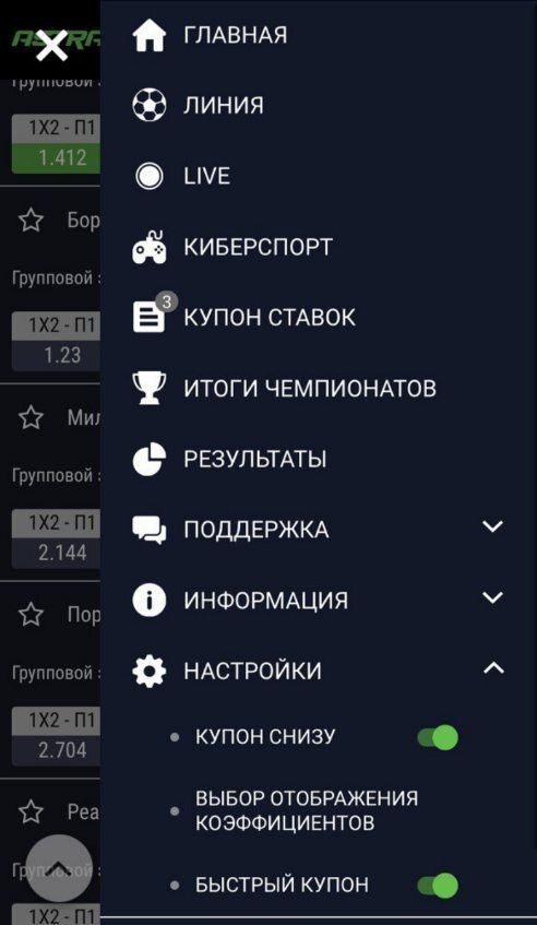 Быстрый купон. Если опция активирована, купон сразу же появится при выборе коэффициента. Если неактивна, ставки будут добавляться без всплывающих окон.