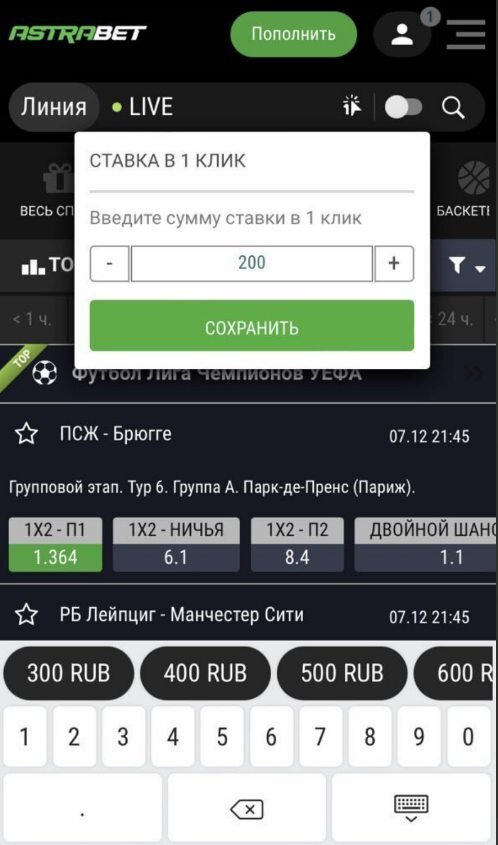 Ставки в один клик. Кнопка активации ставки в один клик также постоянно закреплена в прематчевой и лайв линиях. Нажмите на иконку в виде цифры «1» с курсором для настройки суммы ставки. Рычаг возле иконки отвечает за включение/выключение функции. Если рычаг подсвечивается зелёным, значит ставка в один клик активирована.