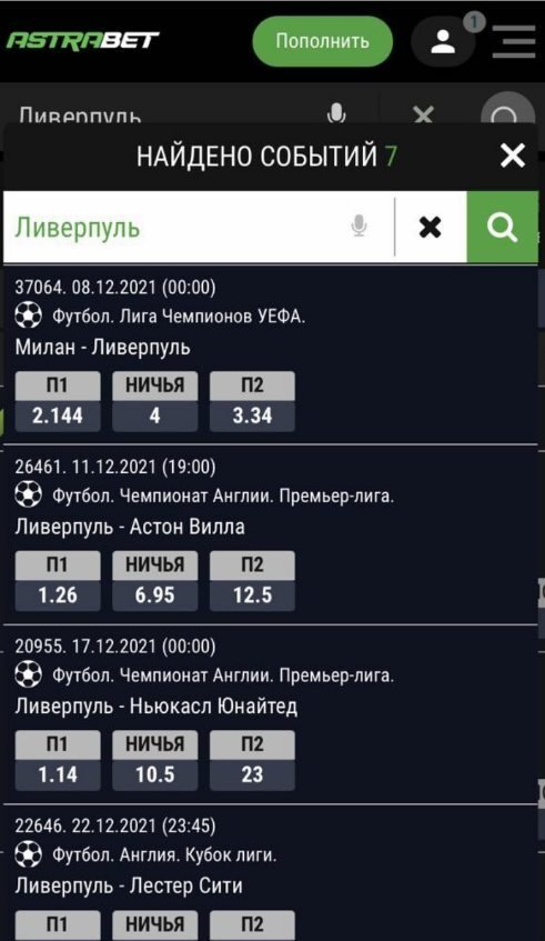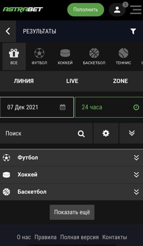 Результаты. Пользователи мобильной версии сайта «Астрабет» могут посмотреть итоги спортивных событий в разделе «Результаты». Их можно отсортировать по формату («Линия», Live или Zone), видам спорта и дате. Также предусмотрена кнопка поиска.