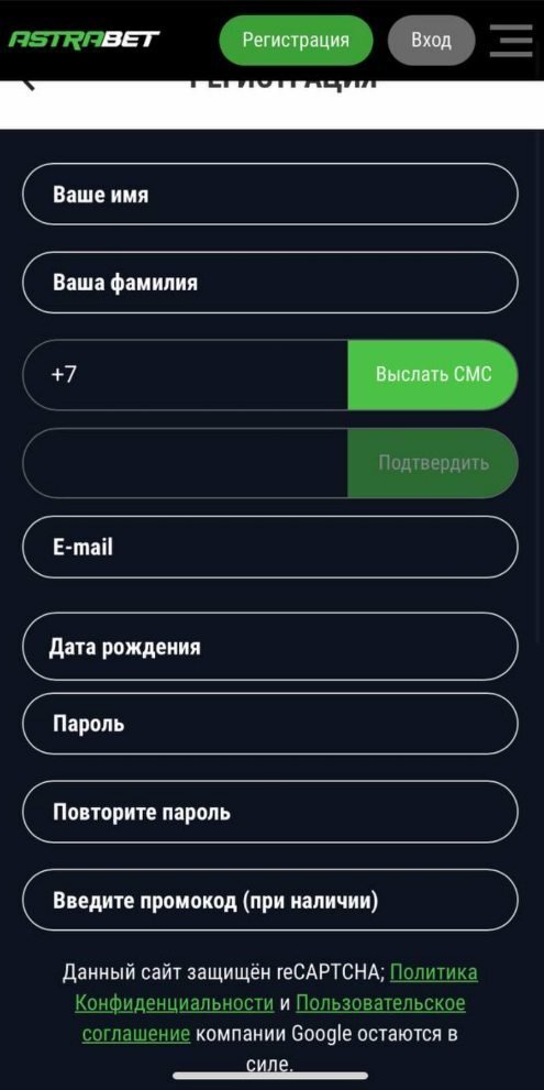 При первом переходе на мобильный сайт astrabet.ru вверху будут расположены две кнопки — «Регистрация» и «Вход». Для создания учётной записи в букмекерской конторе нажмите на «Регистрация» и заполните форму. Указывайте правдивую и актуальную информацию о себе.