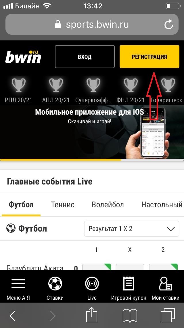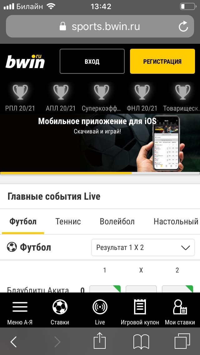 Откройте браузер на смартфоне и введите в адресную строку bwin.ru, после чего вы окажетесь на мобильной платформе.
