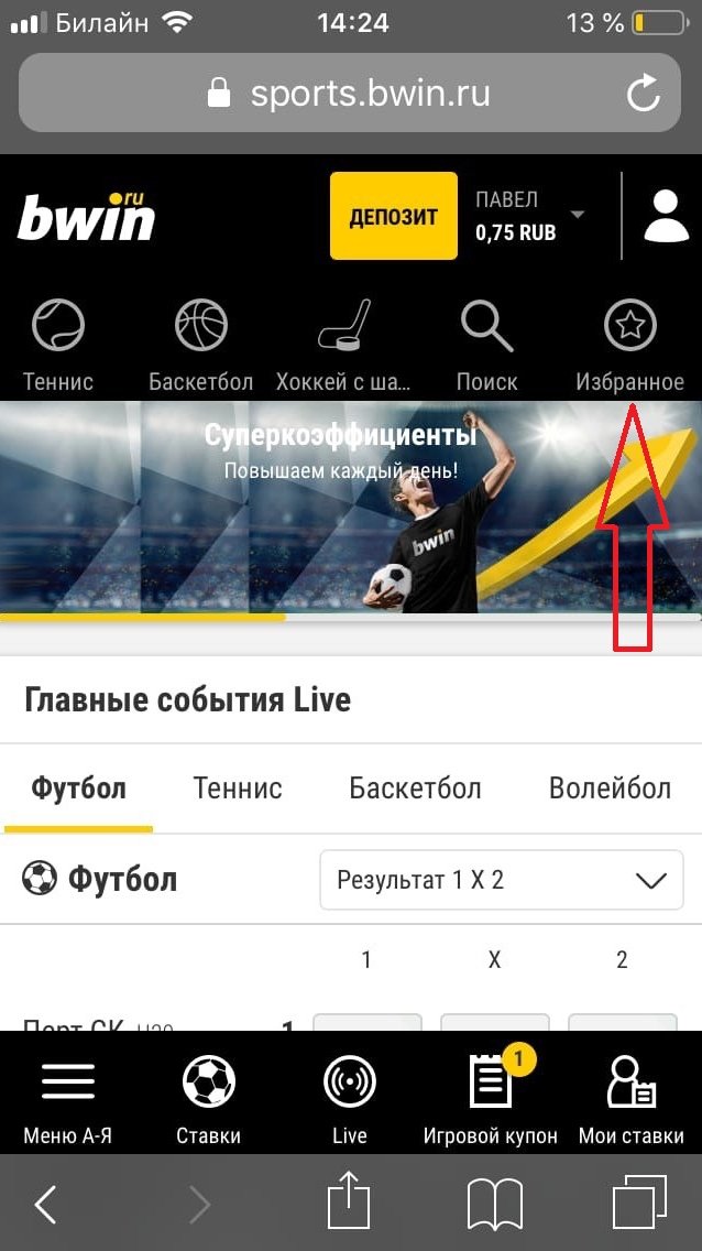 Избранное. Любую игру можно добавить в «Избранное». Для этого выберите противостояние и проведите пальцем вправо по горизонтали. Папка с отобранными событиями находится на верхней панели в конце списка игровых дисциплин.