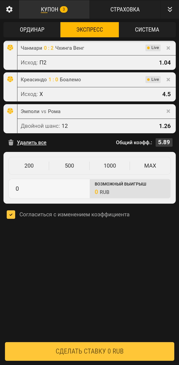 Как делать ставки. Нажатие на коэффициент автоматически откроет корзину. Чтобы включить в купон два события или больше (экспресс), сверните корзину и добавьте в нее другие пари. Для составления системы в купоне должно быть минимум три ставки.