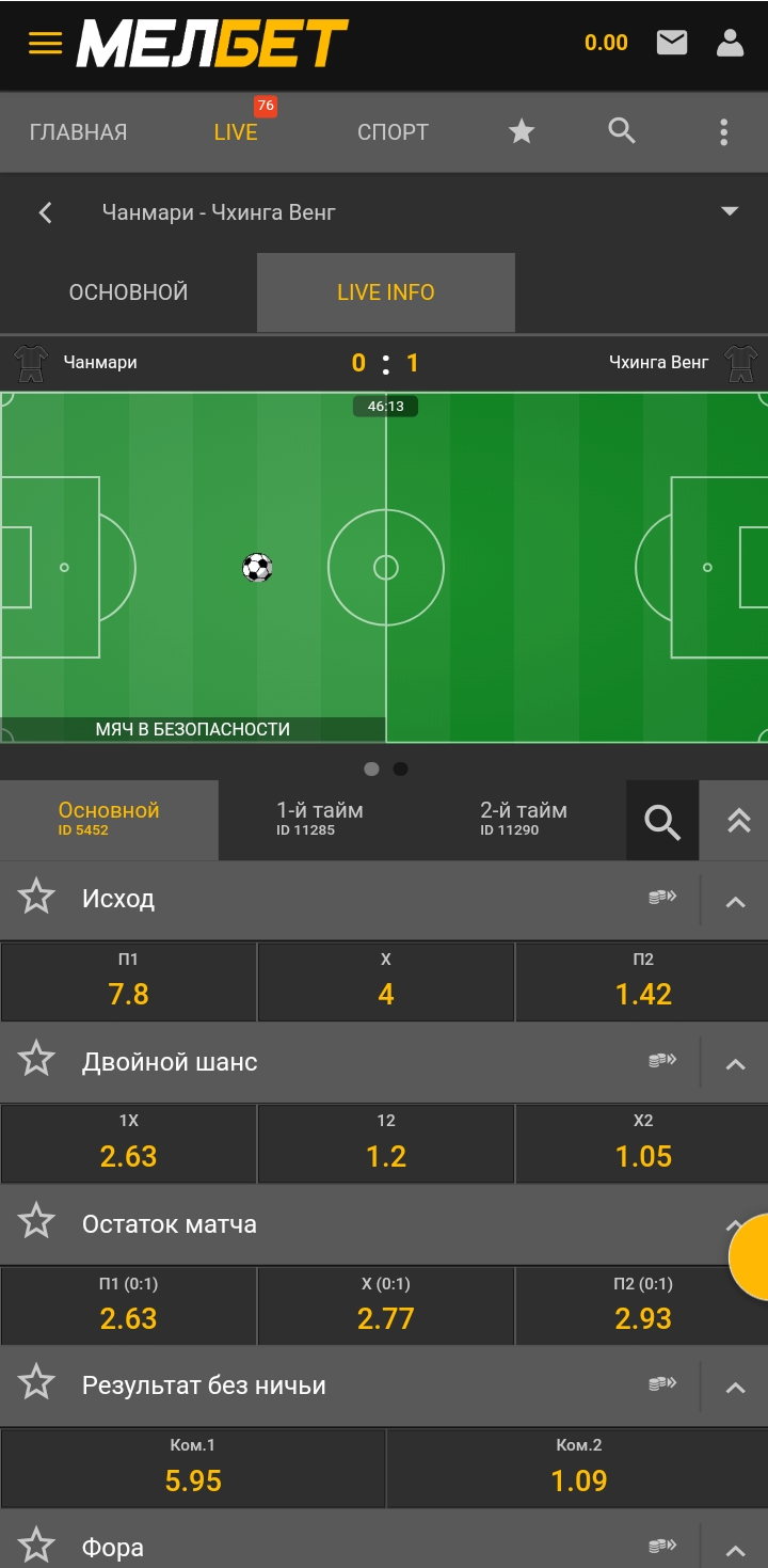 Лайв. В блоке показываются матчи, ставки на которые букмекерская контора Melbet принимает прямо по ходу встречи. На странице матча вы получите доступ к дополнительным возможностям: просмотру графической 3D-трансляции, статистики матча, турнирной сетки или таблицы, истории личных встреч и результата предыдущих таймов (сетов, геймов, иннингов и т.д). 3D-картинка открывается в том же окне, а статистические параметры — в новом. Видеотрансляции на сайте БК «Мелбет» есть для матчей по футболу Первой лиги, киберспорта и некоторых других видов спорта.
