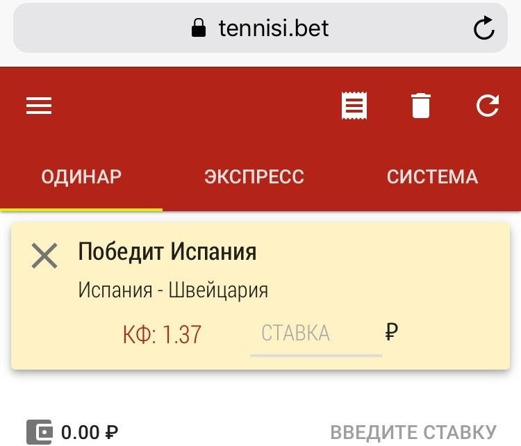 Чтобы сделать одиночную ставку (в «Тенниси» ее называют одинар, а не ординар), нажмите на нужную котировку, перейдите в корзину, введите сумму и кликните «Сделать ставку». Чтобы сформировать экспресс, выберите от двух исходов. Чтобы сформировать ставку системой — от трех.