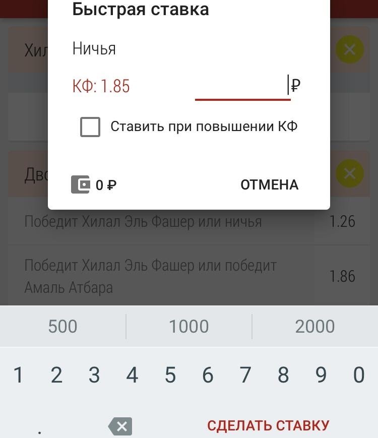 Функционал предусматривает опцию быстрой ставки без перехода в «Корзину». Для этого откройте роспись матча, сделайте долгое нажатие на маркет, укажите размер пари и кликните «Сделать ставку».