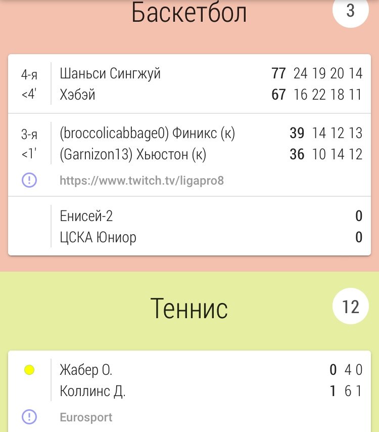 Присутствует разбивка по видам спорта. При этом ни в списке матчей, ни на странице события не указано, в каком турнире играют команды или спортсмены.