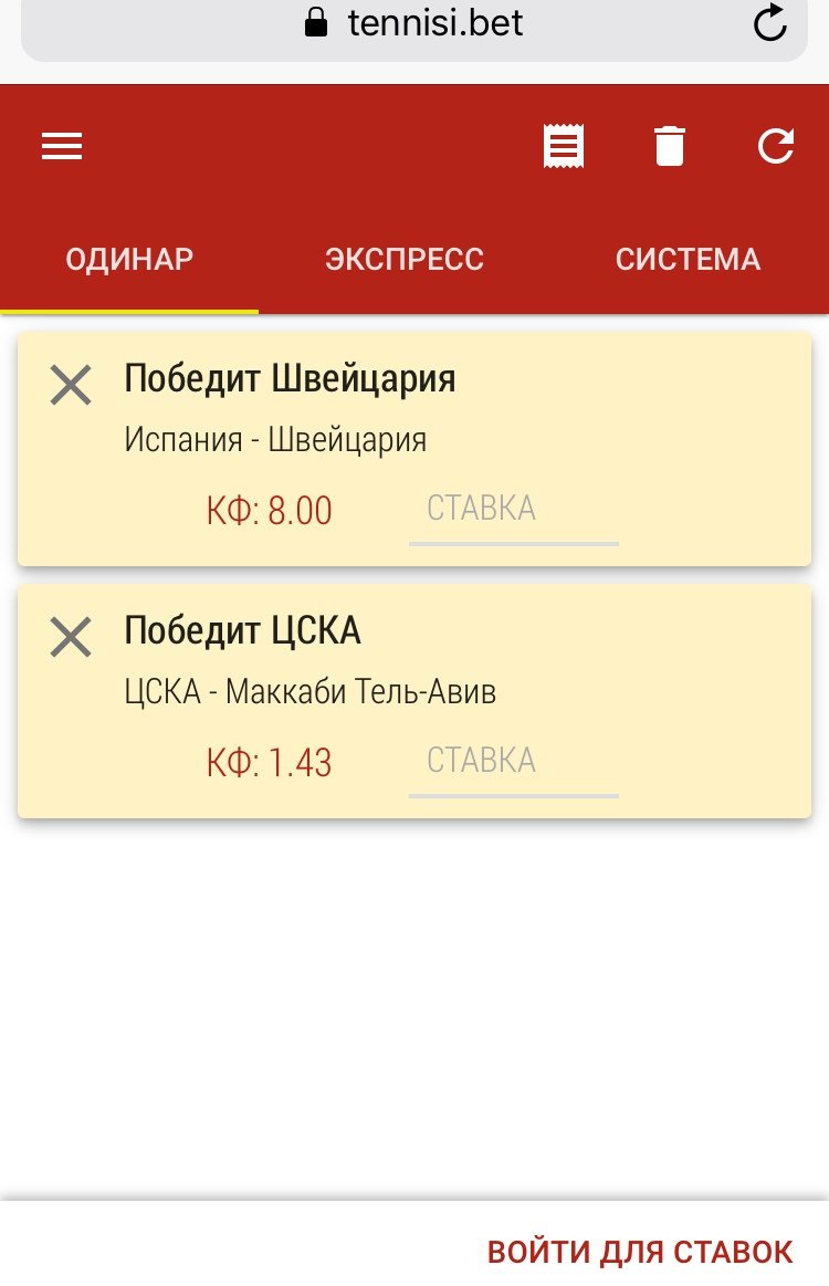 Чтобы сделать одиночную ставку (в «Тенниси» ее называют одинар, а не ординар), нажмите на нужную котировку, перейдите в корзину, введите сумму и кликните «Сделать ставку». Чтобы сформировать экспресс, выберите от двух исходов. Чтобы сформировать ставку системой — от трех.