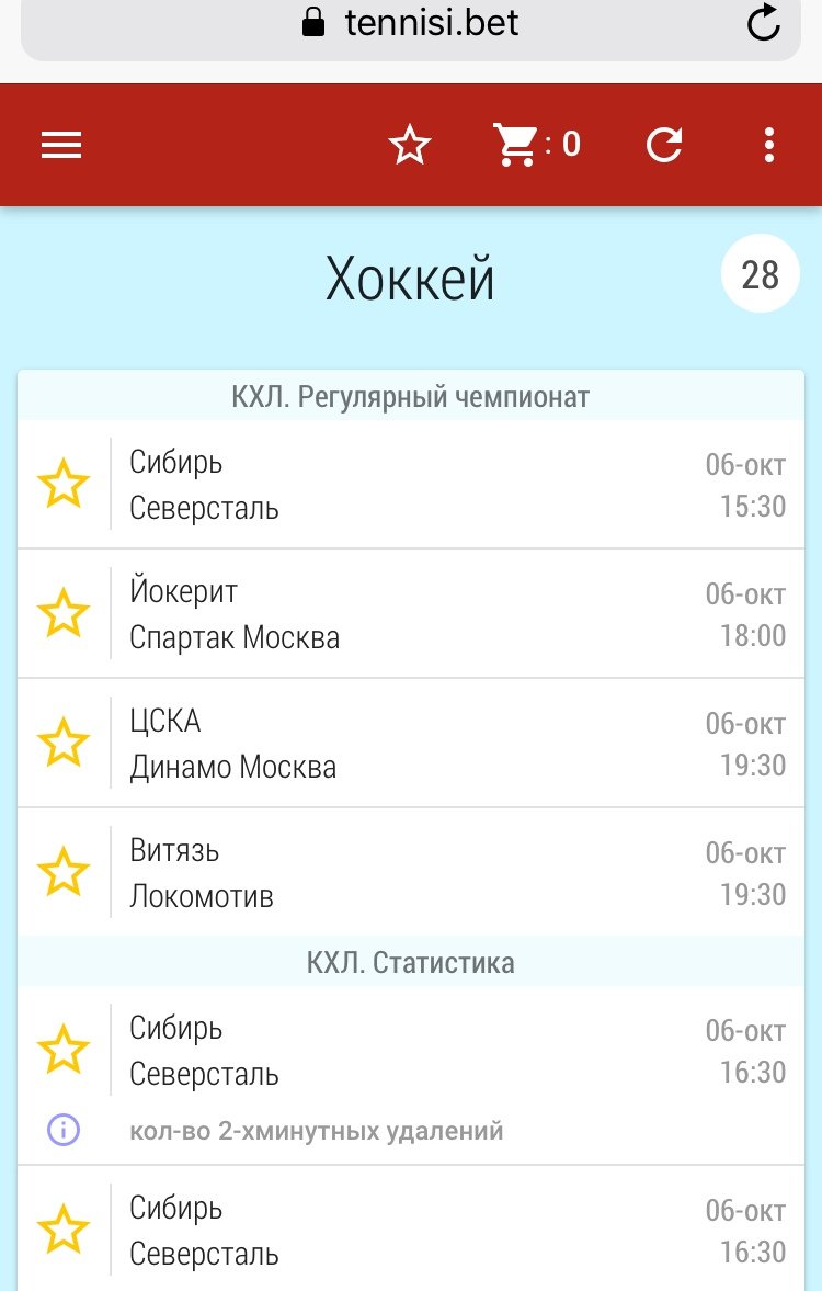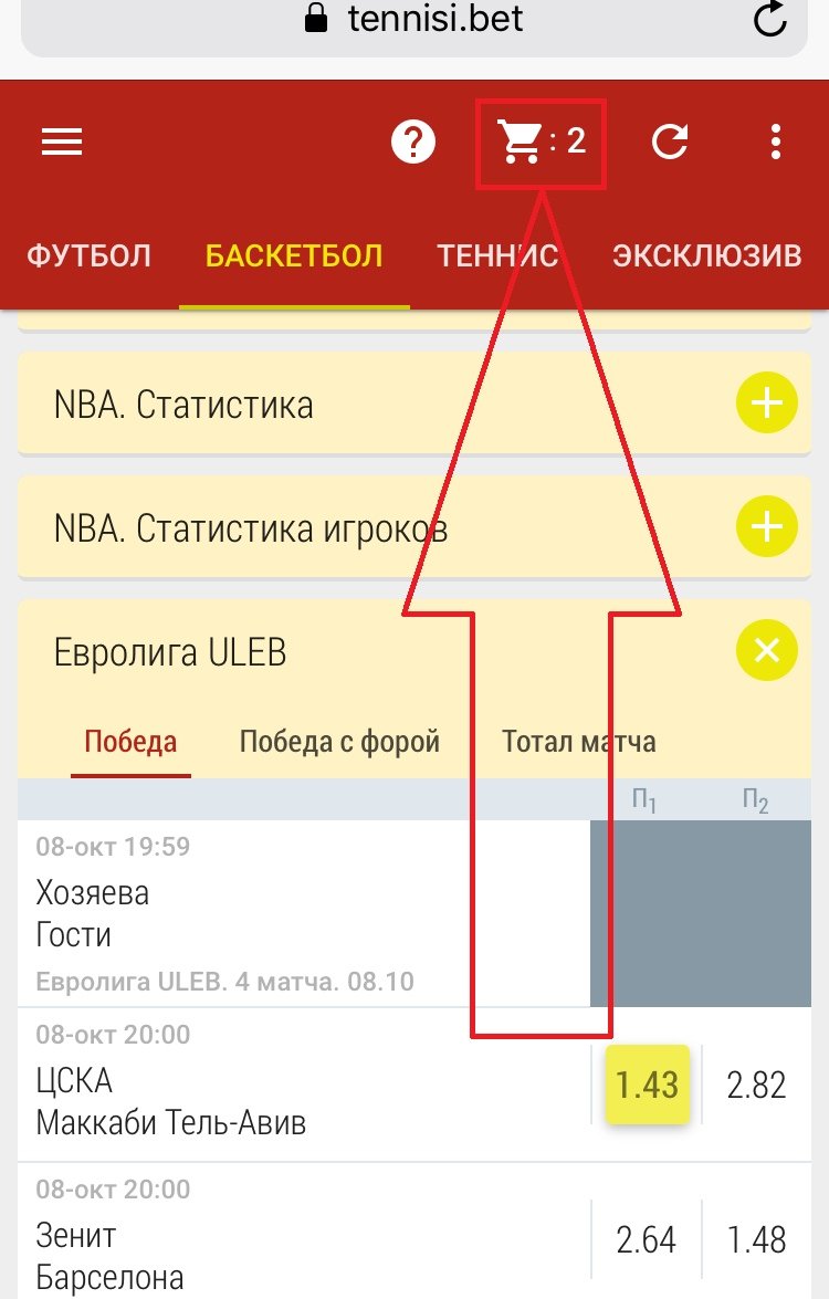 Корзина. Все матчи, на которые пользователь намерен сделать ставки в лайве или линии.
