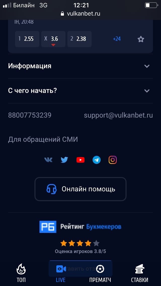 ☝ С 15 декабря 2020-го «Вулканбет» не принимает онлайн-ставки. Компания решила уйти с российского легального рынка из-за ужесточения регулирования.