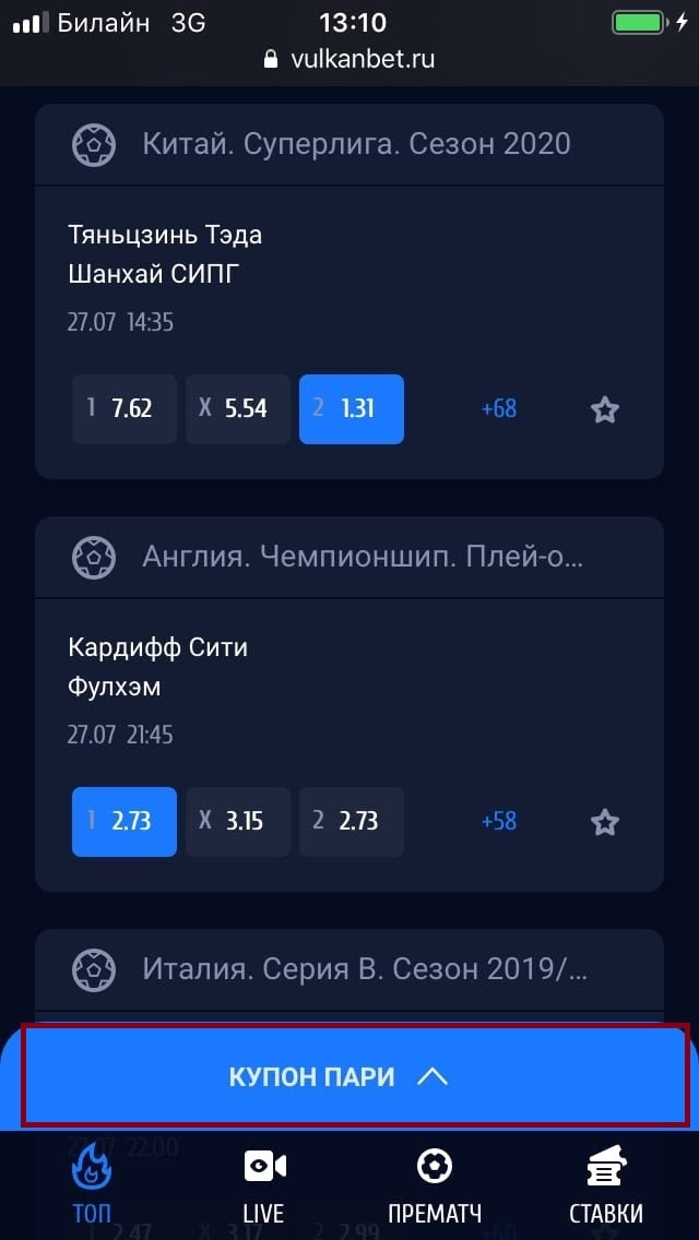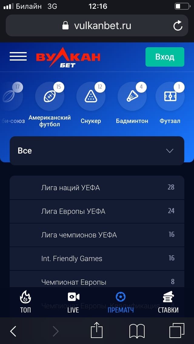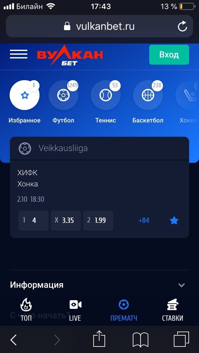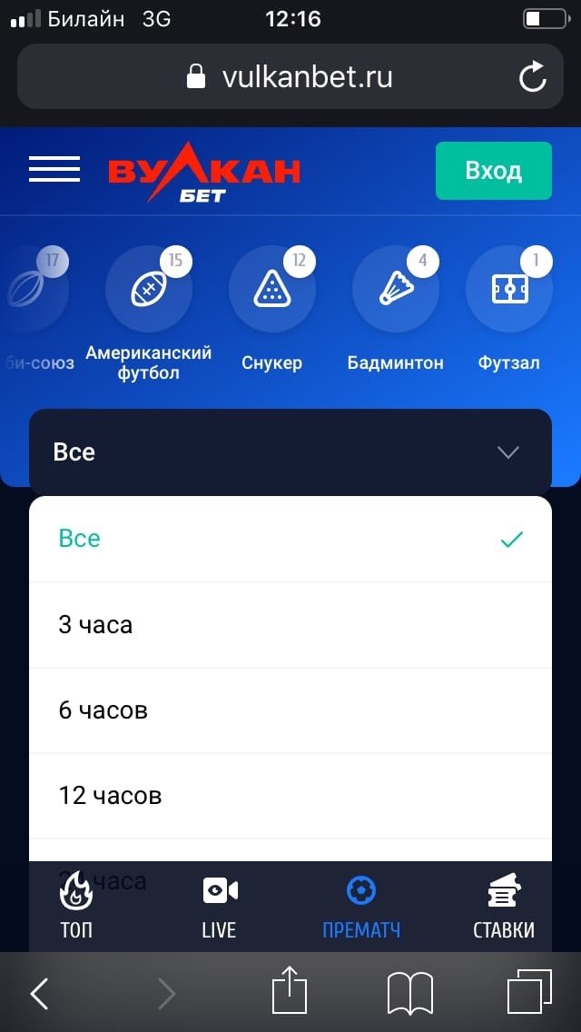 В мобильной версии сайта «Вулканбет» менее подробна базовая роспись событий: не переходя на отдельную страницу, можно поставить только на исход. В десктоп-версии в базовой росписи есть также ставки на фору, тотал и дополнительный исход.