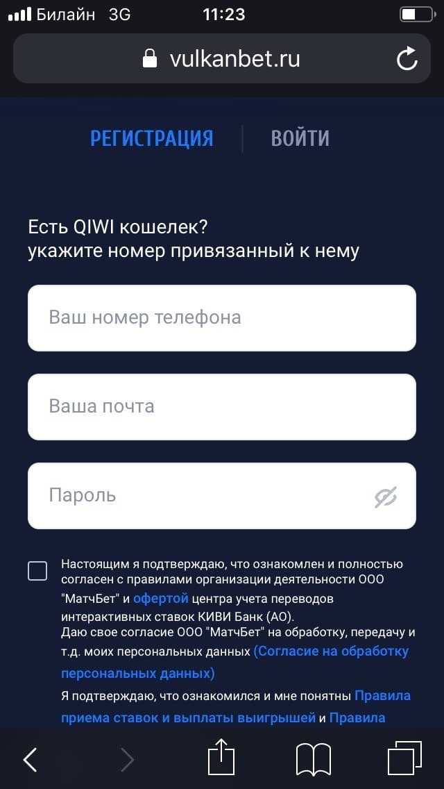 Регистрация в версии «Вулканбета» для смартфонов состоит из пяти шагов: