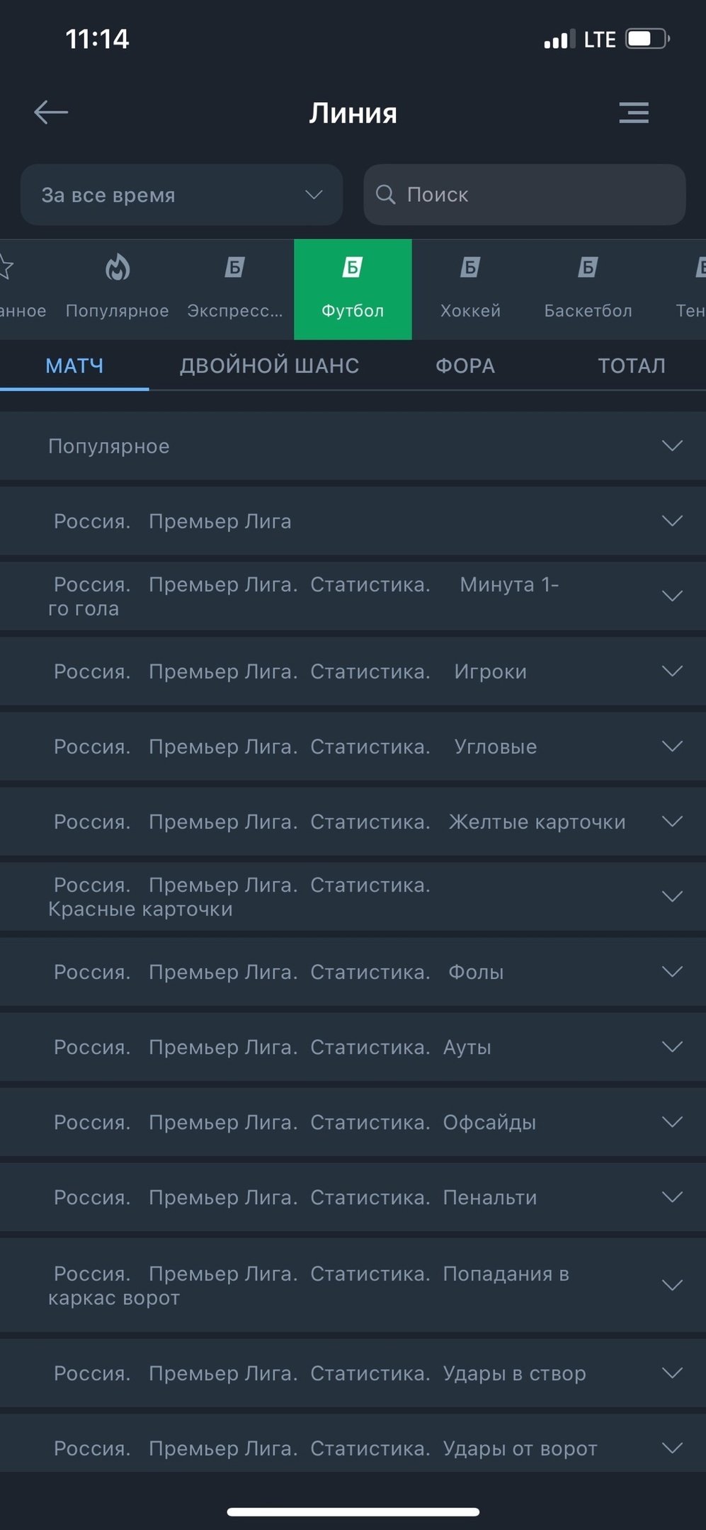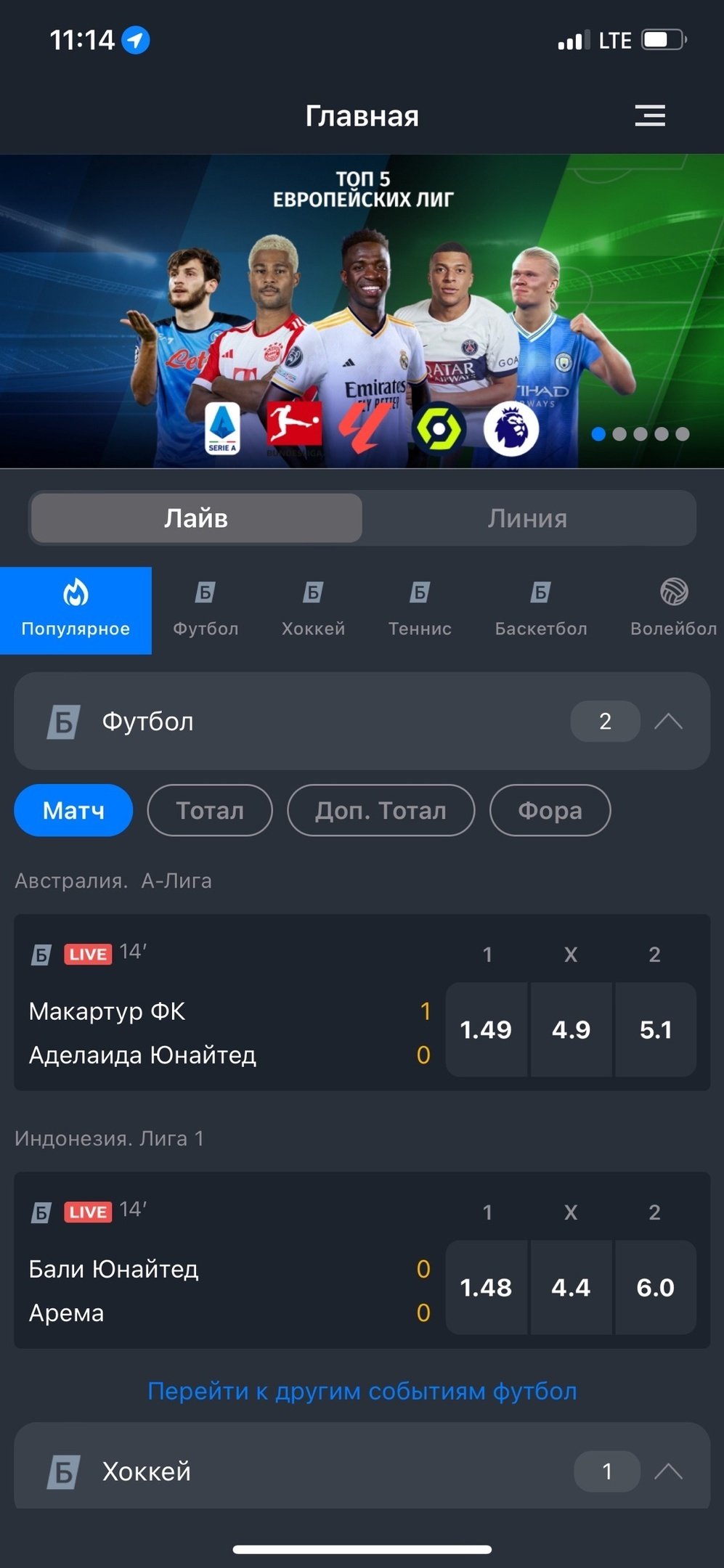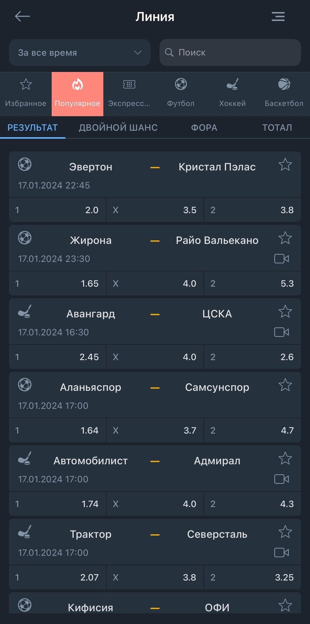 Показ матчей можно отсортировать по популярным событиям и видам спорта. Интересующие игры можно также найти через строку поиска и добавить их в «Избранное» для быстрого доступа.