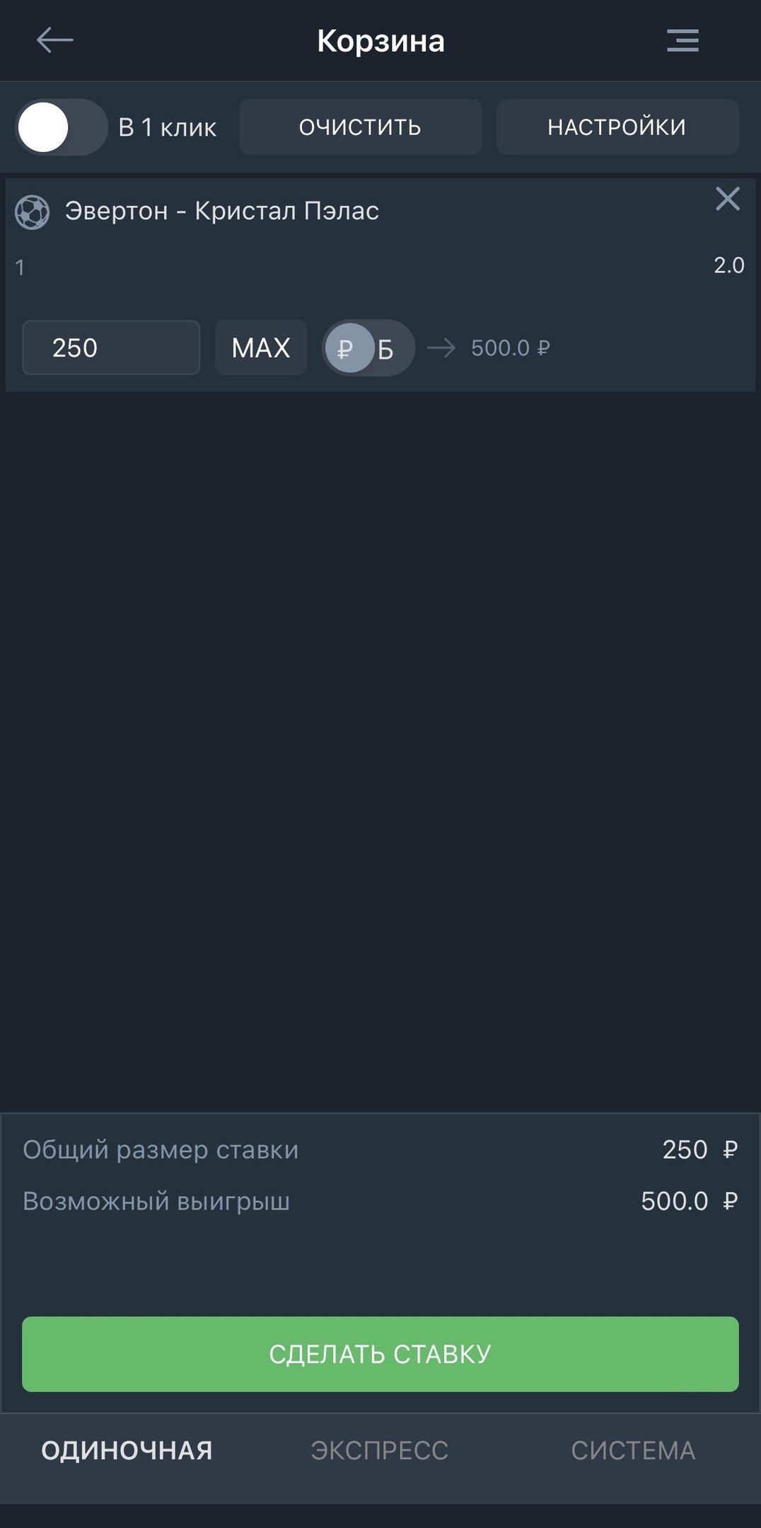 Ознакомьтесь с условиями, выберите вид ставки на вкладке и в случае одиночной ставки введите сумму.