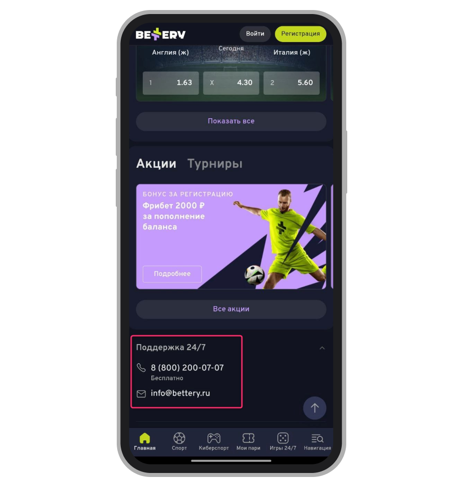 Некоторые элементы интерфейса изменили свое положение. Номер телефона и почтовый адрес службы поддержки можно найти в разделе «Поддержка 24/7», который находится в самом низу главной страницы. Связаться с поддержкой можно по телефону (8 800 200 07 07) или по электронной почте (info@bettery.ru).