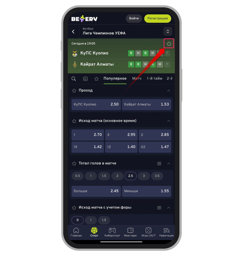 Для поиска нужных матчей воспользуйтесь фильтрами по видам спорта, популярным матчам, играм в топовых турнирах. Интересующие события также можно найти через строку поиска. Кроме того, матчи для быстрого доступа можно добавлять в «Избранное», нажав на соответствующий значок.
