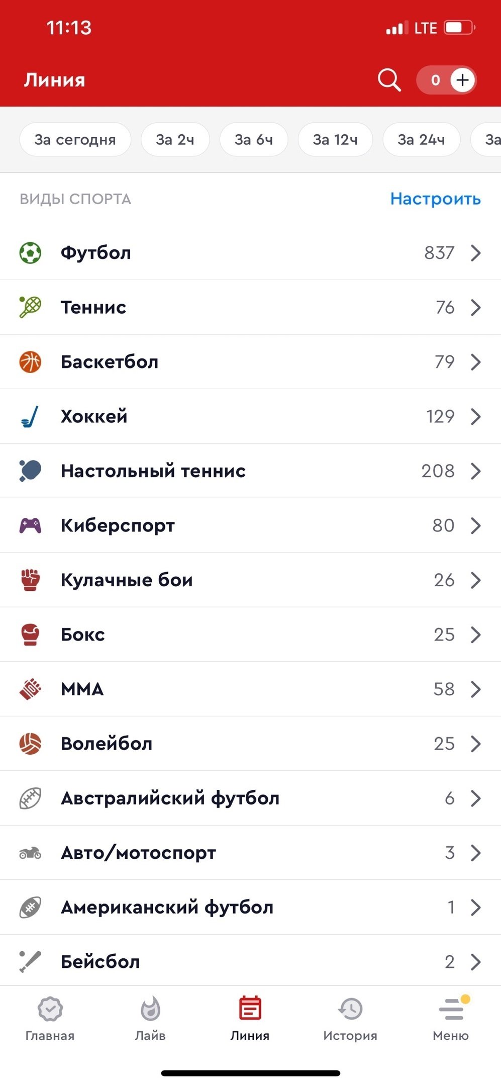 События для ставки разделены по двум пунктам меню — «Линия» и «Лайв». Их можно отфильтровать по видам спорта, а также по времени начала события. Есть поиск матчей и возможность добавить их в «Избранное».