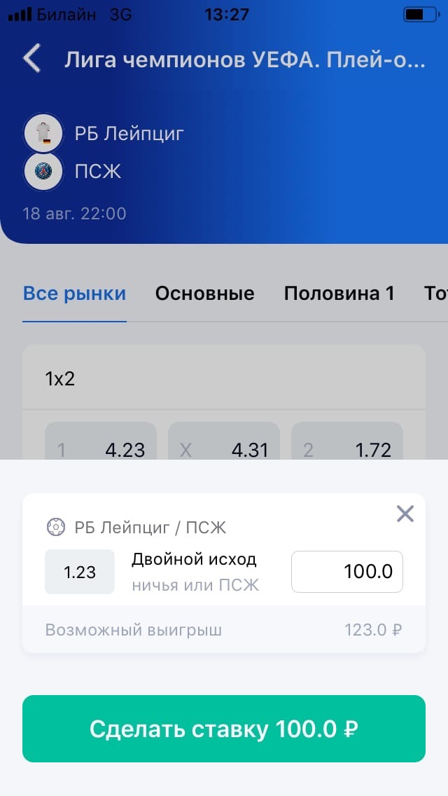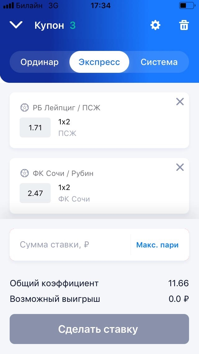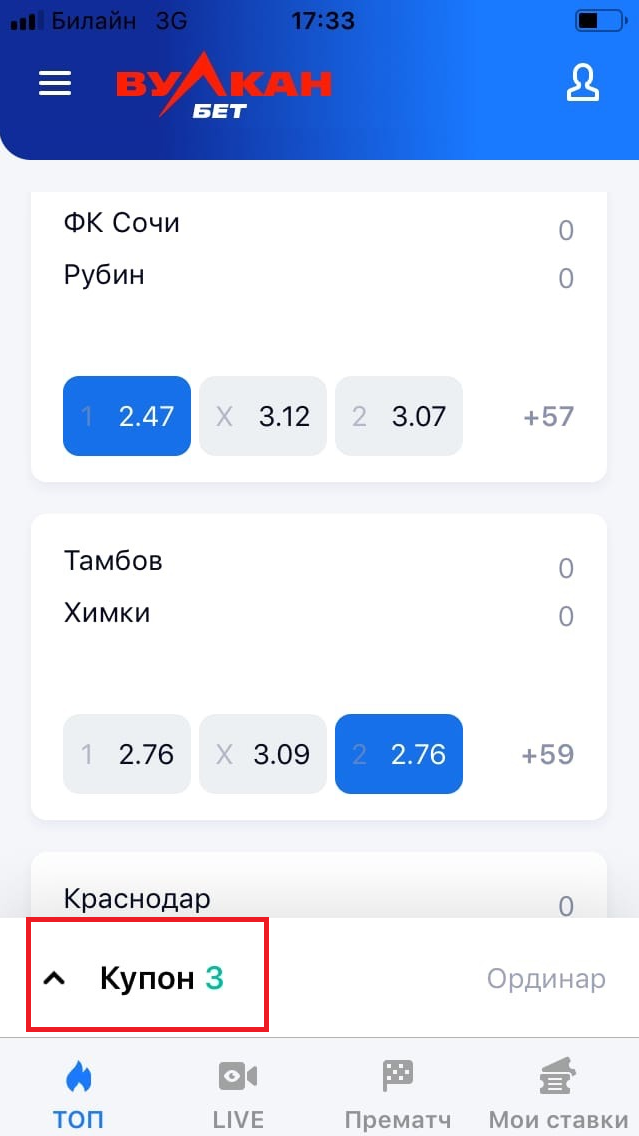 Чтобы заключить пари в мобильном приложении Vulkanbet, выберите интересующий вас матч и нажмите на коэффициент выбранного исхода. Чтобы внести в купон дополнительные ставки для формирования экспресса, нужно нажать на пустую область экрана (фон) и продолжить отбор событий.