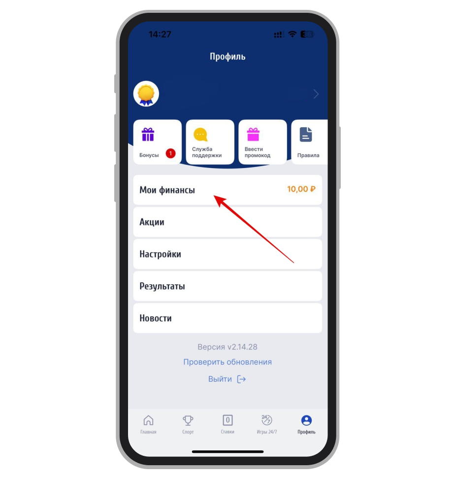 Для внесения депозита или получения выигрыша перейдите в раздел «Мои финансы» в профиле, выберите способ и следуйте инструкции.