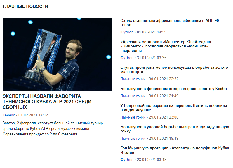В шапке сайта представлены все виды спорта, освещаемые сервисом, и дополнительные разделы: