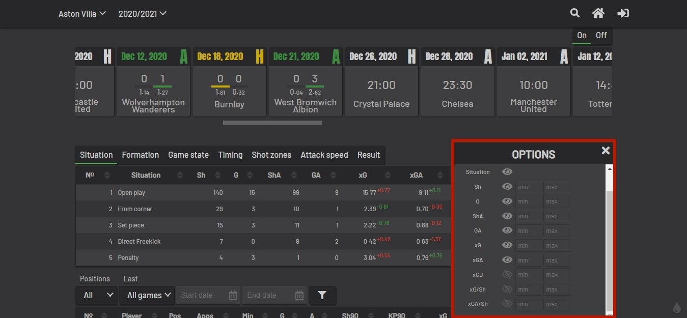 Показатель Expected Goals (xG) оценивает качество ударов по воротам футболистами выбранной команды. Expected Goals Against (xGA) — качество ударов от соперников по воротам конкретной команды.