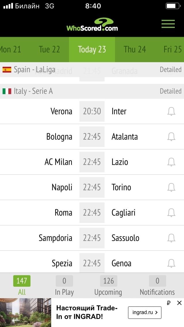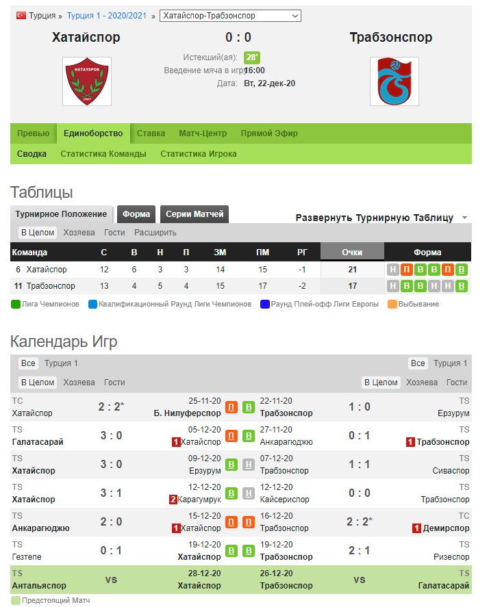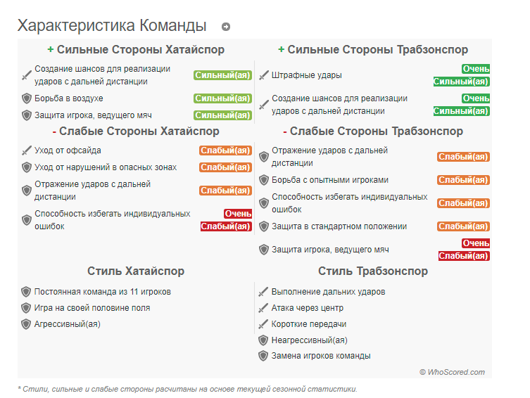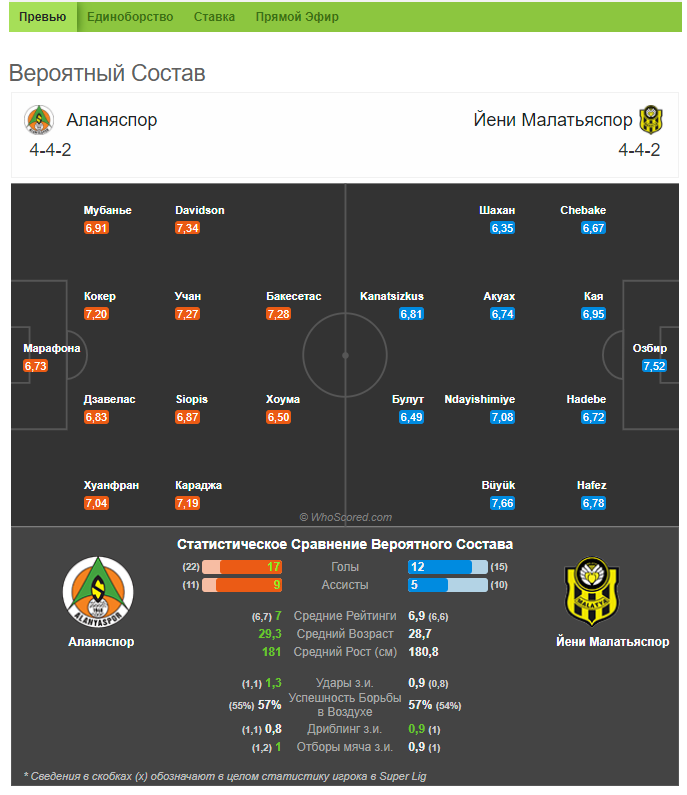Список футбольных противостояний на ближайшие три дня с превью: ориентировочными составами, сравнением ключевых показателей команд, вероятным счетом от WhoScored. Прогноз формируется автоматически в зависимости от последних результатов клубов. Например, если «Аланьяспор» выиграл последние четыре встречи из пяти, забив при этом не меньше двух голов, а «Йени Малатьяспор» отличался по всех гостевых матчах, то сервис предложит счёт 2:1.