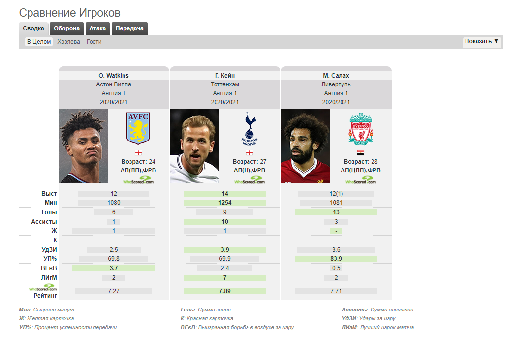 Пользователь может сравнить 2-4 футболистов и оценить, у кого будет больше шансов забить гол. Есть сортировка по турнирам, командам и спортсменам. Раздел полезен не только для ставок на индивидуальную статистику игроков, но и для любителей фэнтези-футбола.