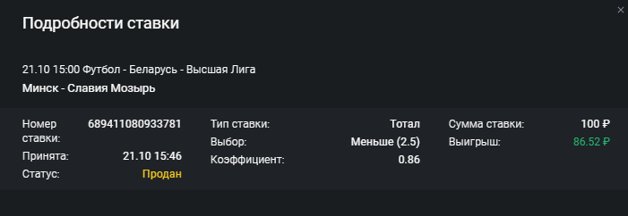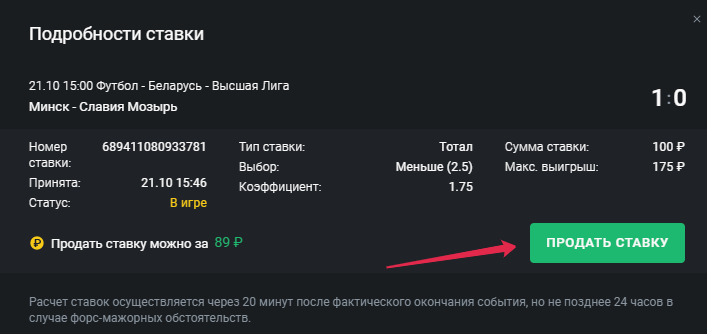 Под статусом пари предложена сумма продажи. Игроку нужно решить, готов ли он выводить ставку на таких условиях. Досрочная выплата будет осуществлена после нажатия кнопки «Продать ставку» без подтверждения.
