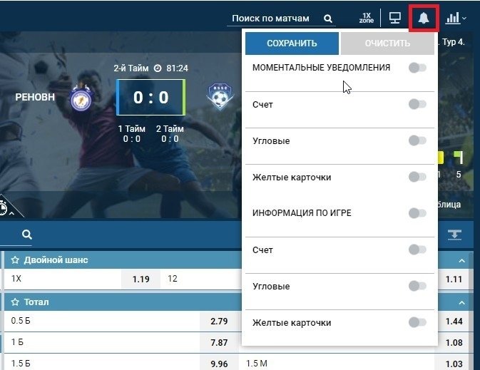 Для игры в режиме Live можно было настроить моментальные уведомления: например, для футбольного матча это была информация об изменении счёта, угловых ударах и жёлтых карточках.